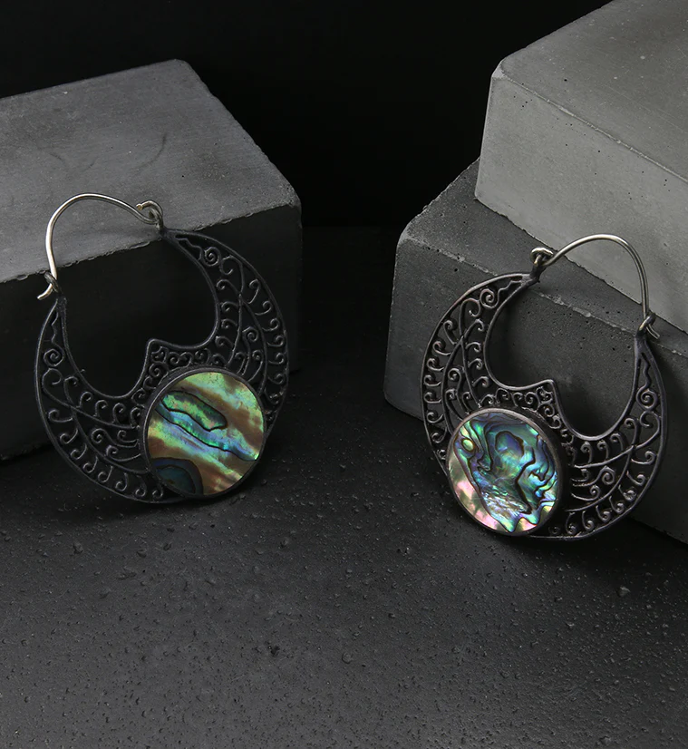 Black brass earrings/hangers made from white brass wire and beautiful abalone inlays that shine with different colors in the light. 18G (1mm) or bigger to wear. Height is 55mm and width is 45mm. Sold in pairs. For healed piercings.