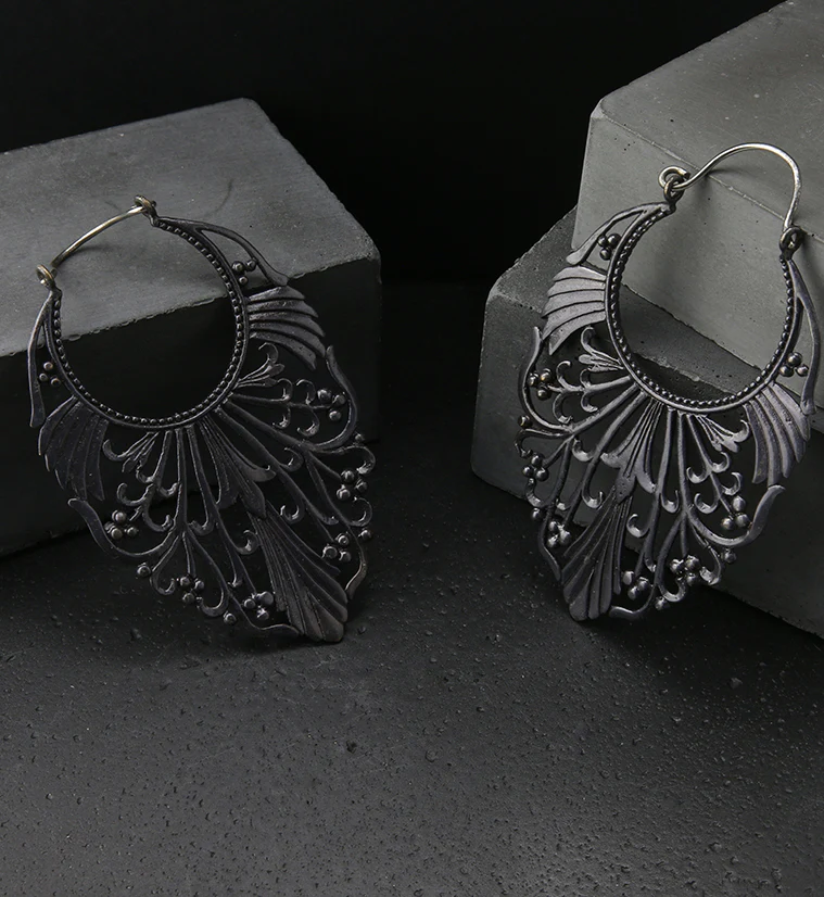 Ornately adorned black brass earrings/hangers. Made from white brass wire. 18G (1mm) or bigger to wear. Height is 78mm and width is 44mm. Sold in pairs. For healed piercings.