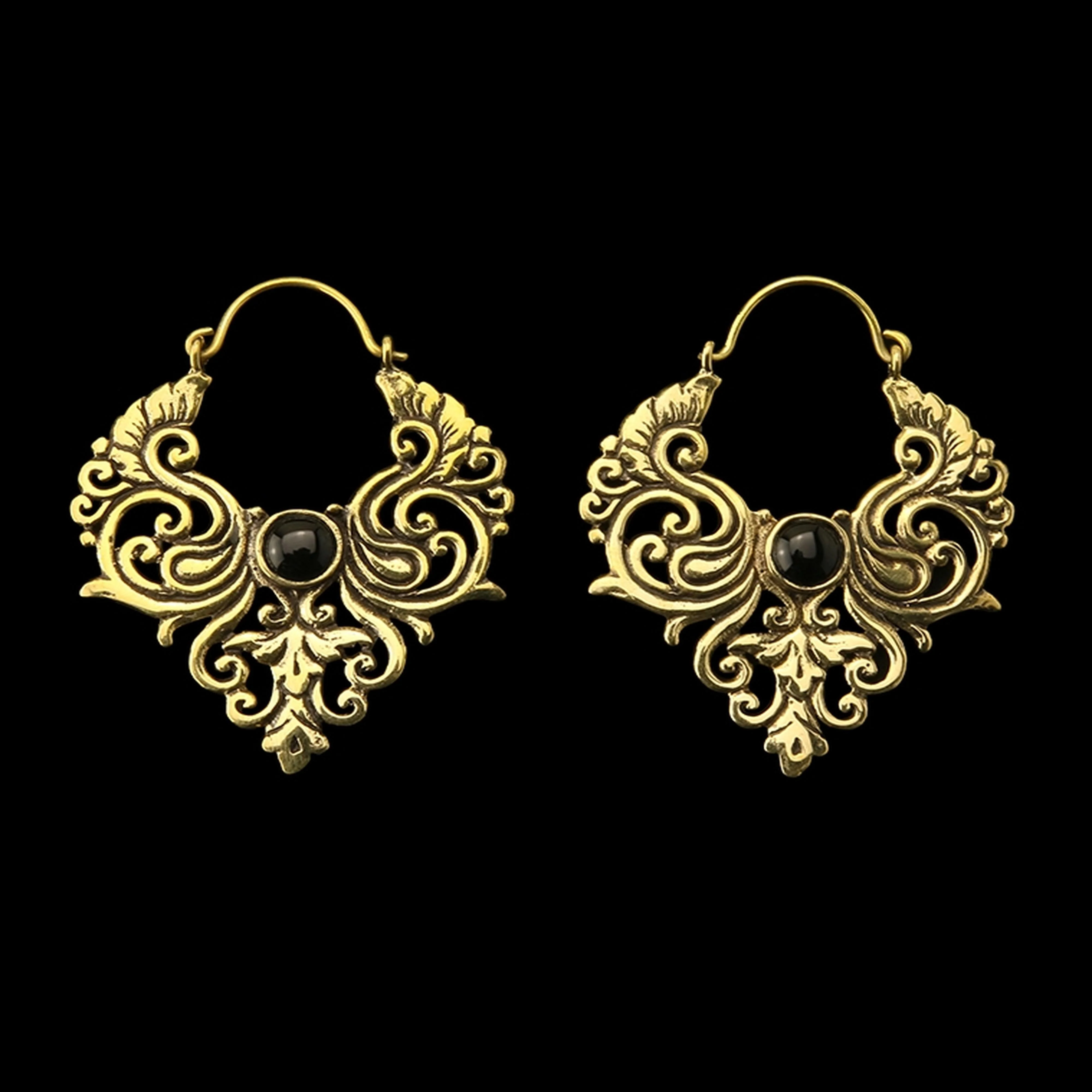 These 18G Lacey Onyx Earrings feature a bold black Onyx stone inlay, adding a touch of edgy elegance to any outfit. Made of brass, these 48mm x 38mm earrings are perfect for healed piercings. Please note that brass is not meant for long term wear, it may oxidize under extreme moisture conditions.