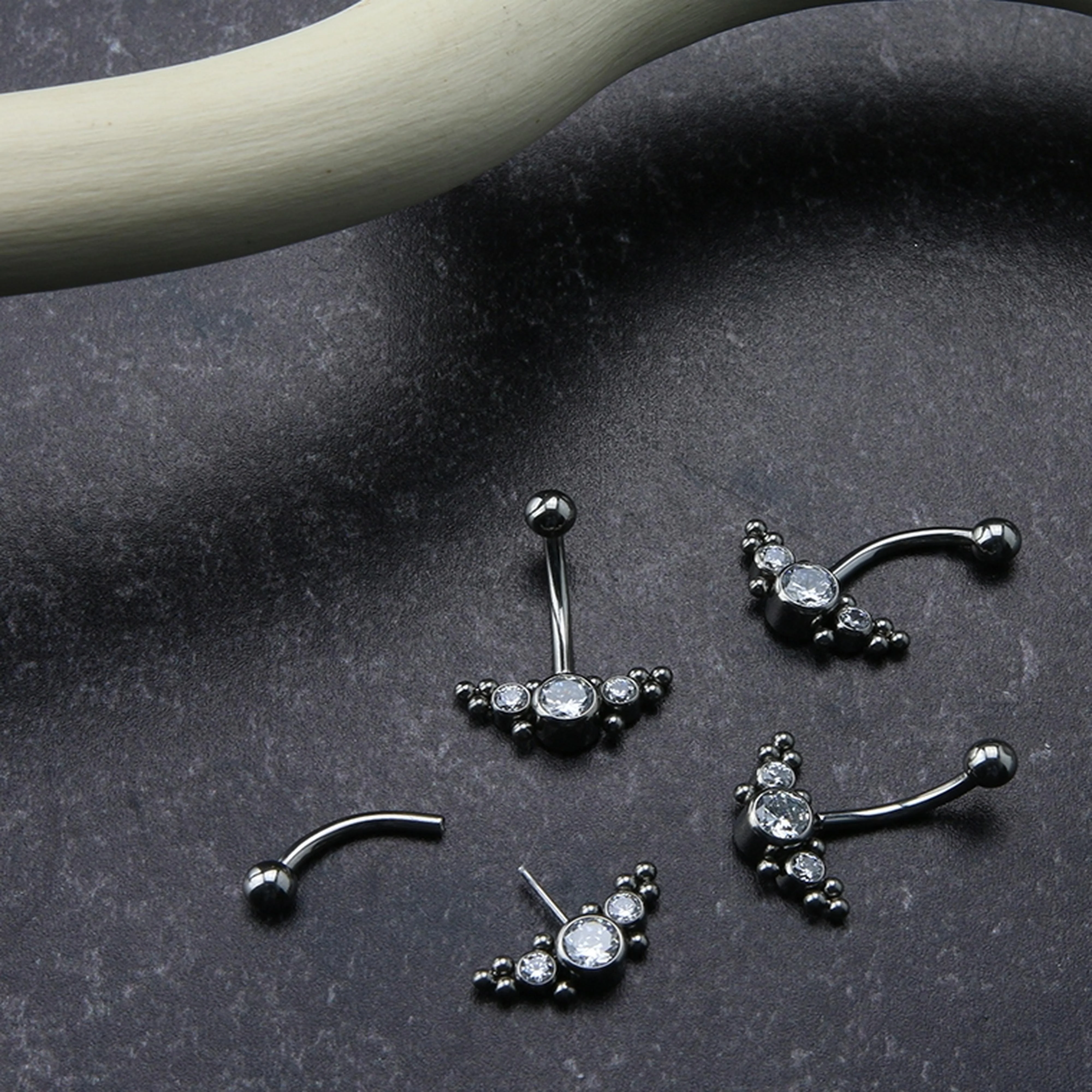 Sparkling curved barbells decorated with a cluster of clear cz gems and beaded accents. The top piece has a threadless design for easy insertion and removal. Made from ASTM F-136 titanium. Inner length is 5/16" (8mm). Comes in 16G with a 2.5mm ball on the end. Sold individually. Great for eyebrow piercings!Ā