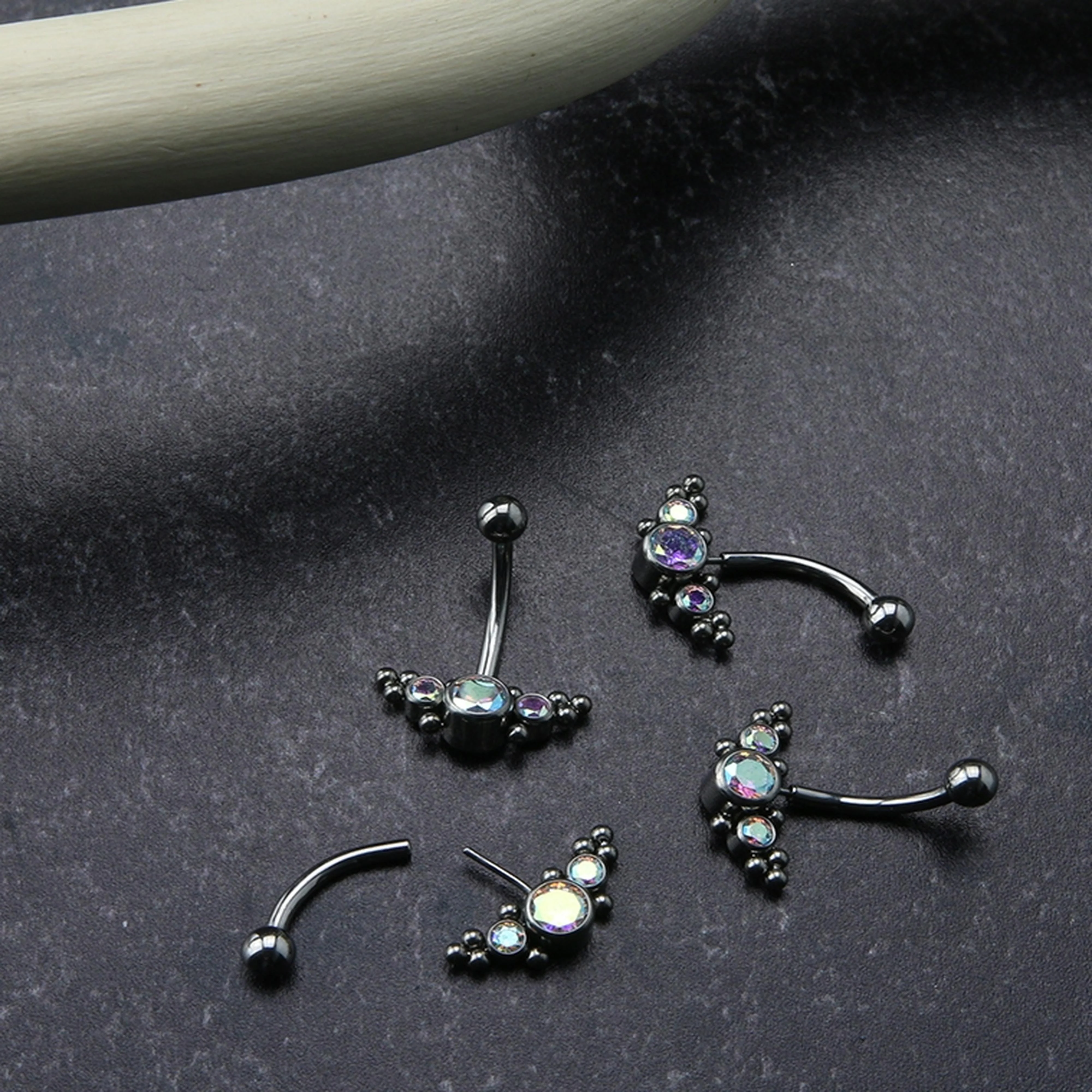 ColorfulĀ curved barbells decorated with a cluster ofĀ rainbow auroraĀ cz gems and beaded accents. The top piece has a threadless design for easy insertion and removal. Made from ASTM F-136 titanium. Inner length is 5/16" (8mm). Comes in 18G or 16G with a 2.5mm ball on the end. Sold individually. Great for eyebrow piercings!Ā